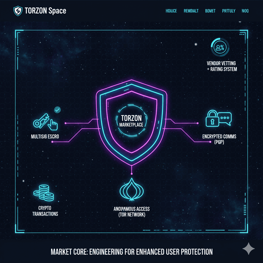 Key security features built into the Torzon Market itself, designed to protect user funds, data, and transactions within its ecosystem.
